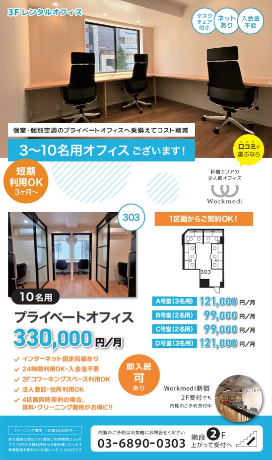 Workmedi新宿の3Fに2~10名様向けのオフィスがございます!