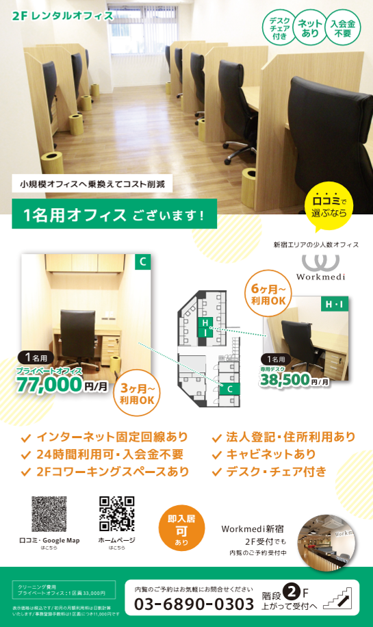 Workmedi新宿の2Fに1名様向けオフィスに空室の予定がございます!